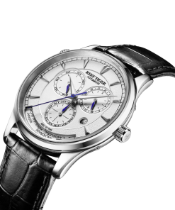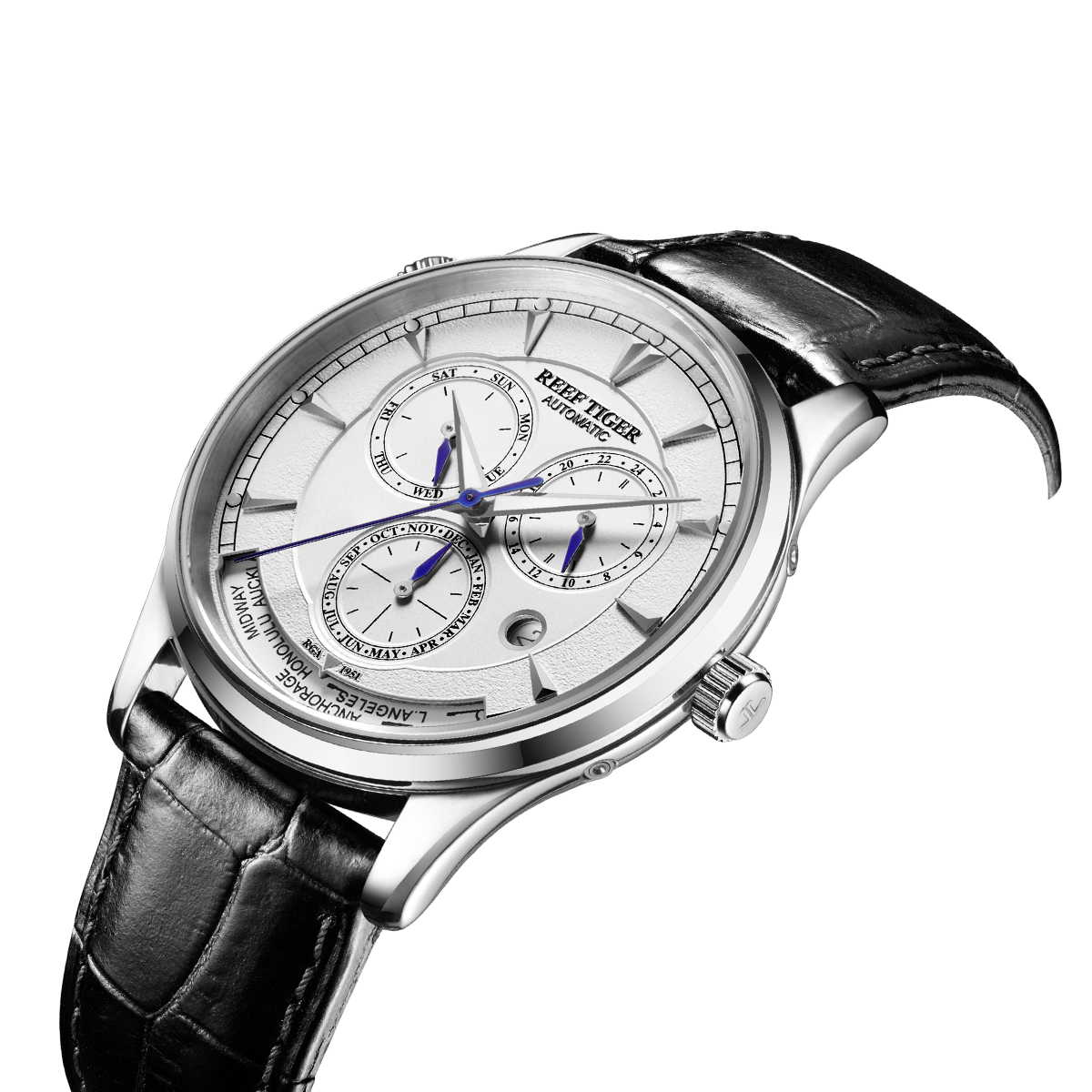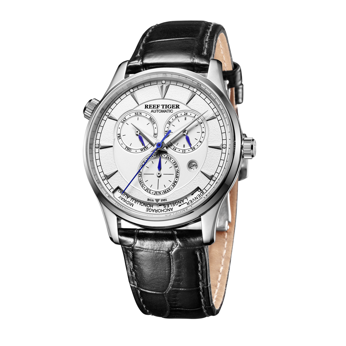 白色表盤,帶棒狀標(biāo)記。日期指示器顯示在表盤的 10 點鐘位置??梢允褂觅徺I的腕表的免費工具調(diào)整日期。當(dāng)腕表上弦時,動力儲存至少可達(dá)到 40 小時。RT7151 自動機芯的動力儲存約為 48 小時。24 小時指示,指針顯示在 2 點鐘位置。您可以按下表殼上 2:00 處的按鈕進行調(diào)整。但請不要在晚上 8:30 至次日凌晨 3:30 之間調(diào)整,因為在此期間星期功能正在更改。月份指示子表盤顯示在 6 點鐘位置。此外,此子表盤下方還顯示世界時間指示器。Reef Tiger Geographer 系列手表提供兩種款式可供選擇,包括不銹鋼款和玫瑰金款。