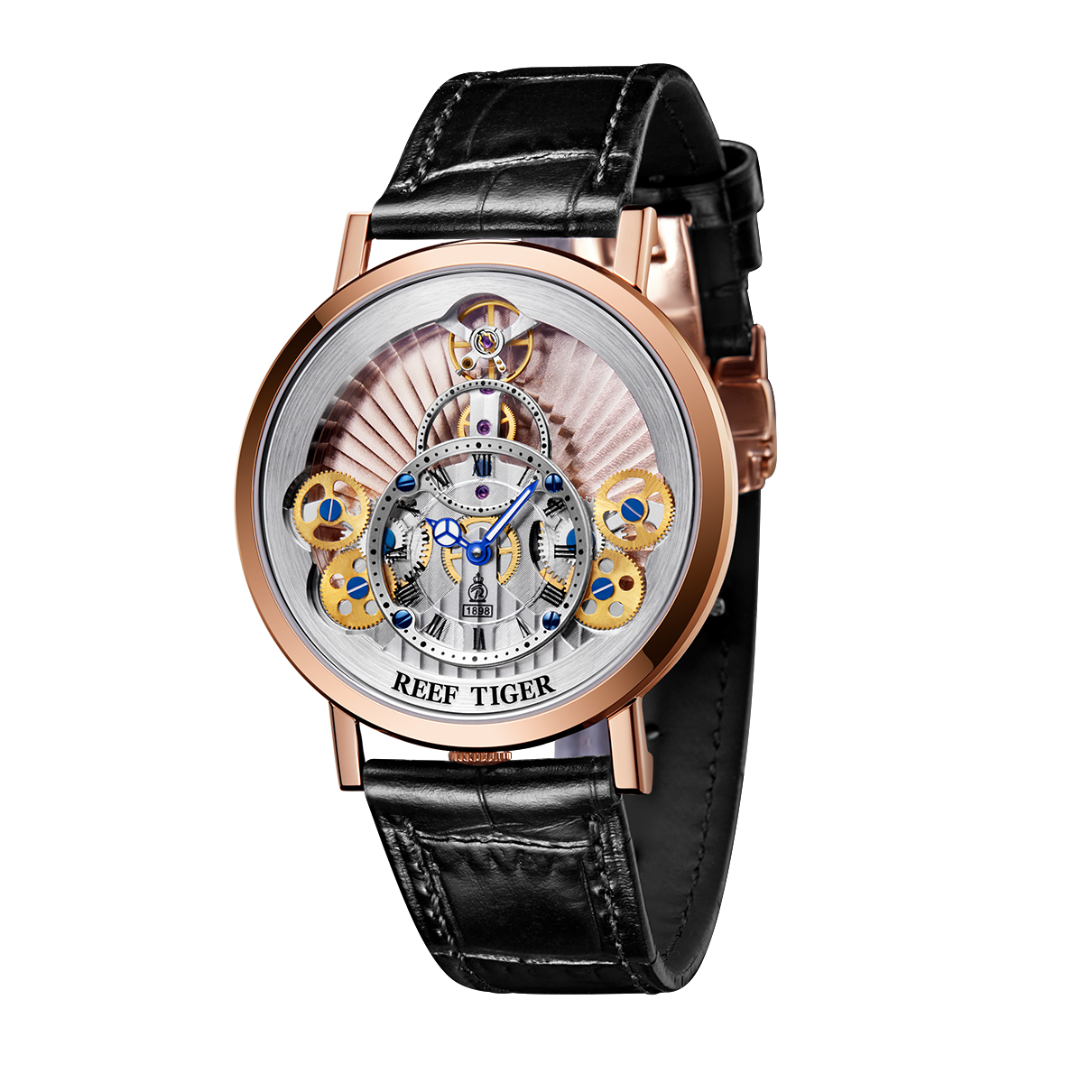 鏤空表盤搭配銀色內(nèi)圈。 Reef Tiger Rotation 腕表采用傳統(tǒng)的鏤空藝術(shù)家設(shè)計(jì),通過空間和三維展示腕表的美感和獨(dú)特性。鏤空、雕花等復(fù)雜元素的運(yùn)用與傳統(tǒng)制表工藝的古典裝飾藝術(shù)相得益彰。