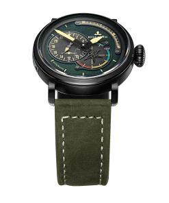 綠色表盤,配黃色棒和數(shù)字標(biāo)記。小時、分鐘和日期顯示。