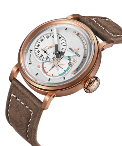 Aurora Pilot 腕表。耐用的不銹鋼表殼鍍有玫瑰金,還配有打造專業(yè)外觀的提案和演示。耐用的聚酯前后蓋與協(xié)調(diào)。