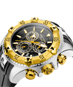 黑色表盤,帶 Super-LumiNova 標(biāo)記和三個子表盤。計時碼表、小時、分鐘、秒和日期顯示。這款豪華腕表在表盤 12 點鐘位置有其標(biāo)志。