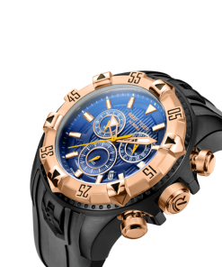 藍色表盤帶有 Super-LumiNova 標記和三個子表盤。計時碼表、小時、分鐘、秒和日期顯示。這款豪華腕表在表盤 12 點鐘位置有其標志。