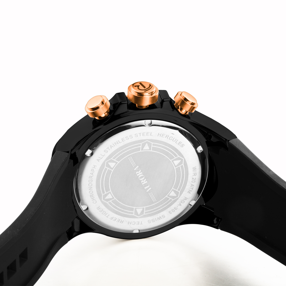Aurora Hercules 計時腕表。耐用的不銹鋼玫瑰色表圈也適合打造專業(yè)的提案和演示。耐用的聚酯前后蓋與協(xié)調(diào)。