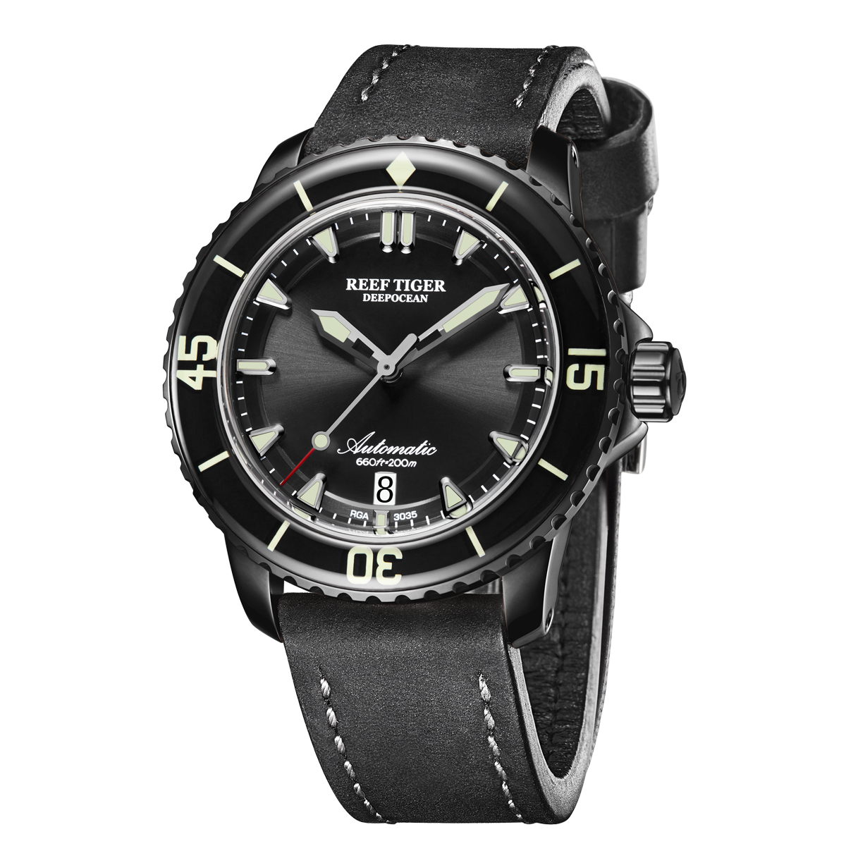純黑色表盤,帶棒狀標記。直徑 44.5 毫米。非常優(yōu)雅和經典。作為一款商務腕表,簡單易讀是 Reef Tiger 一直追求的目標。 6點鐘位置的日期顯示窗口帶來更好的佩戴感。