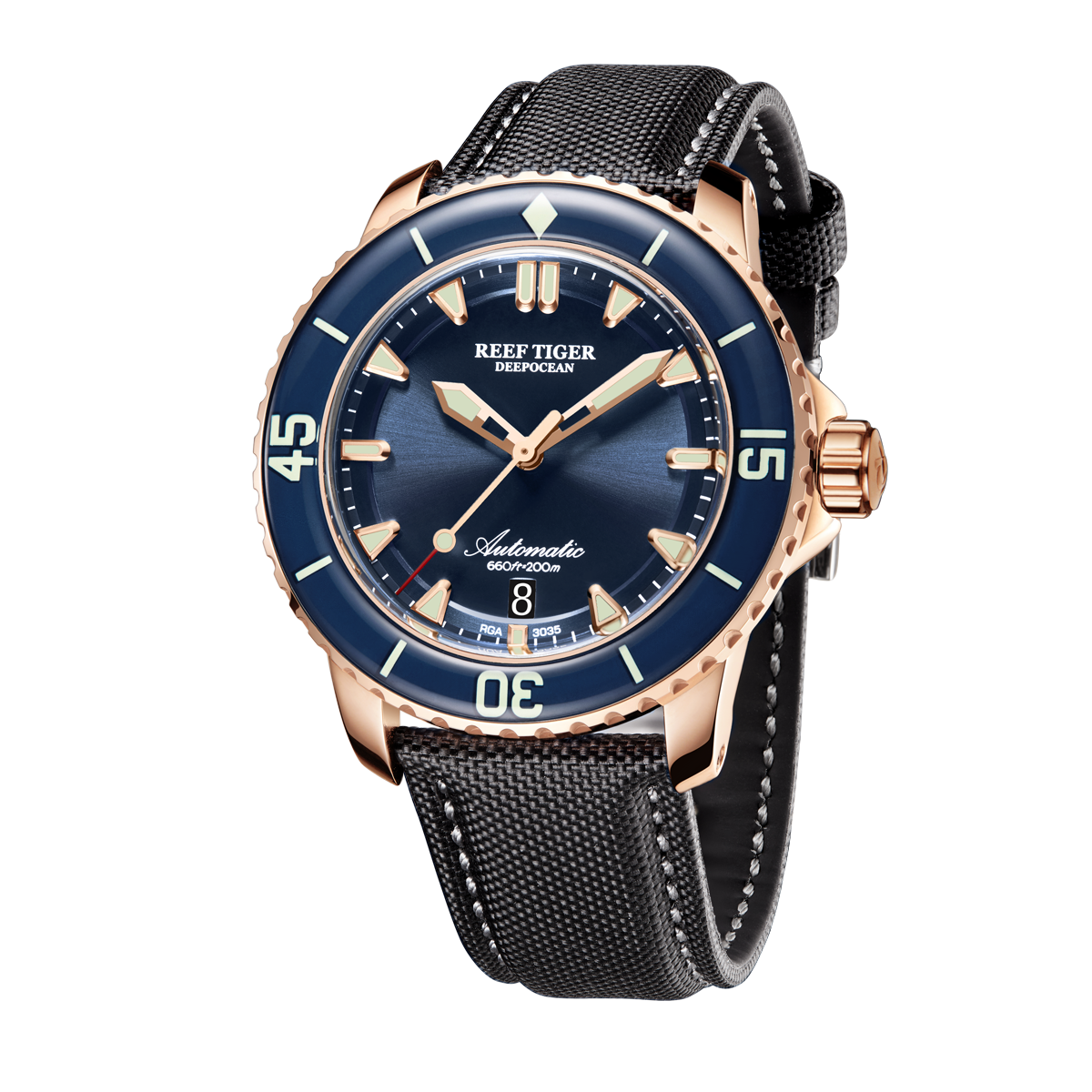 純藍(lán)色表盤,帶棒狀標(biāo)記。直徑 44.5 毫米。非常優(yōu)雅和經(jīng)典。作為一款商務(wù)腕表,簡單易讀是 Reef Tiger 一直追求的目標(biāo)。 6點(diǎn)鐘位置的日期顯示窗口帶來更好的佩戴感受。