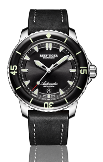 純黑色表盤,帶棒狀標(biāo)記。直徑 44.5 毫米。非常優(yōu)雅和經(jīng)典。作為一款商務(wù)腕表,簡單易讀是 Reef Tiger 一直追求的目標(biāo)。 6點鐘位置的日期顯示窗口帶來更好的佩戴感。