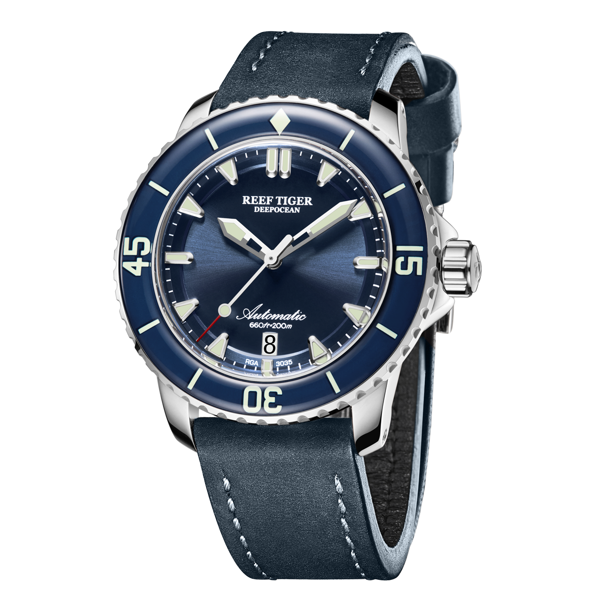 純藍色表盤帶棒狀標記。直徑 44.5 毫米。它非常優(yōu)雅和經(jīng)典。作為一款商務(wù)腕表,簡單易讀是 Reef Tiger 一直追求的目標。 6點鐘位置的日期顯示窗口帶來更好的佩戴感。