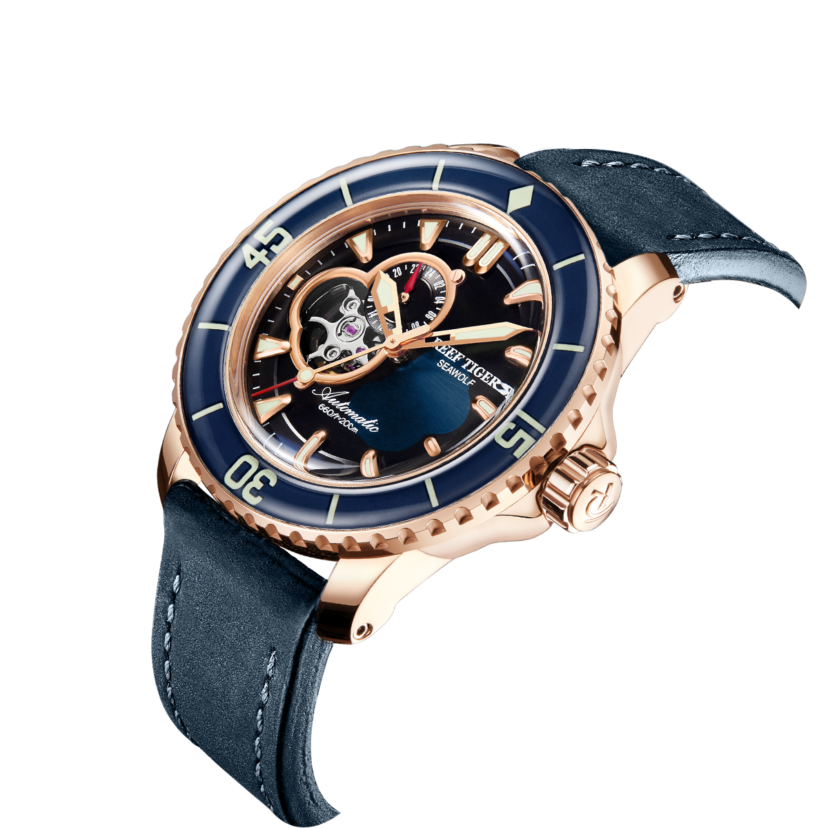 Aurora Sea Wolf 手表。耐用的不銹鋼表殼鍍有玫瑰金,44 毫米的手表輪廓非常圓潤美觀。凹槽表冠,優(yōu)質(zhì)表殼,堅固的弧形表耳,貼近手腕,佩戴舒適,彰顯個性。