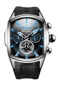 藍(lán)色表盤,帶夜光棒標(biāo)記和大型超級夜光指針。陀飛輪、小時、分鐘、秒。這手表的表盤 12 點(diǎn)鐘位置有其標(biāo)志。