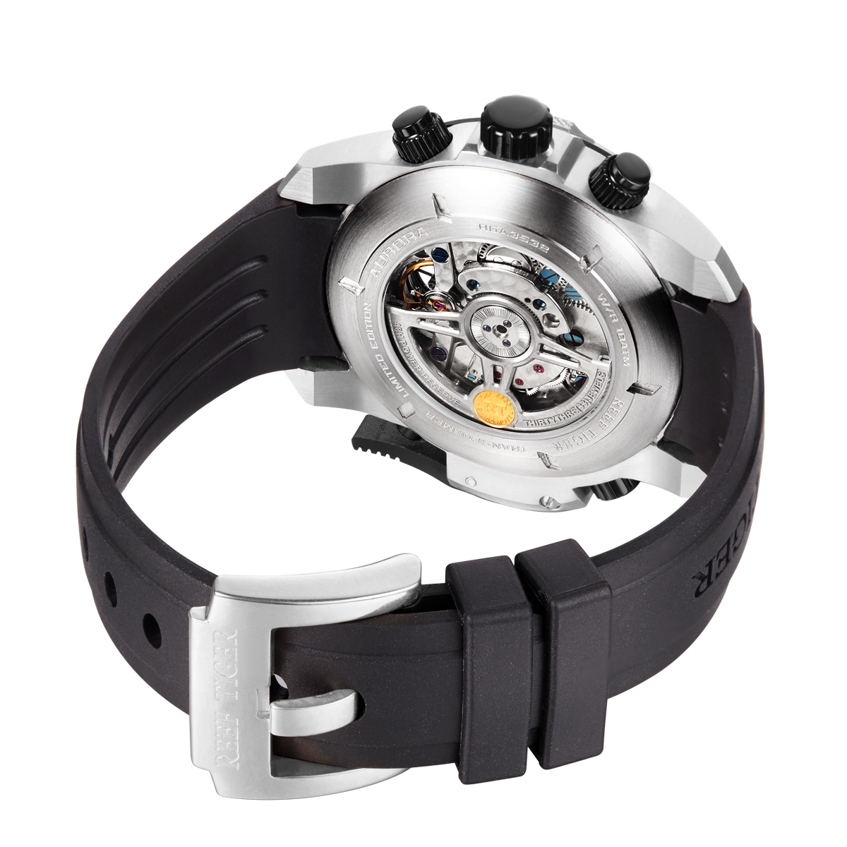 黑色表盤,帶兩個(gè)子表盤。 陀飛輪框架顯示在 6 點(diǎn)鐘位置,年份和月份顯示在 12:00 位置,星期顯示在 9.00 位置,日期顯示在 3.00 位置。