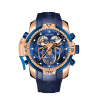 藍(lán)色表盤搭配玫瑰金蜘蛛。 12:00 處顯示年份和月份, 9 點(diǎn)顯示星期,3 點(diǎn)顯示日期。