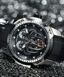 黑色表盤搭配黑色蜘蛛。 12:00 顯示年份和月份,星期9 點(diǎn)位置,3 點(diǎn)位置顯示日期。