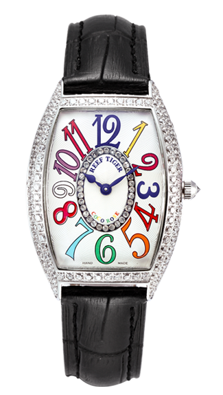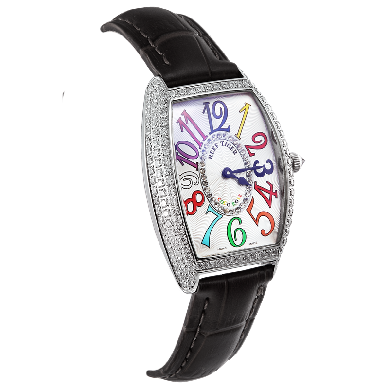 女士 Coco Rose 手表。酒桶形表殼,鑲嵌 2 排圓形華洛世奇鉆石,還配有打造專(zhuān)業(yè)外觀的提案和演示。耐用的聚酯前后蓋,搭配協(xié)調(diào)。