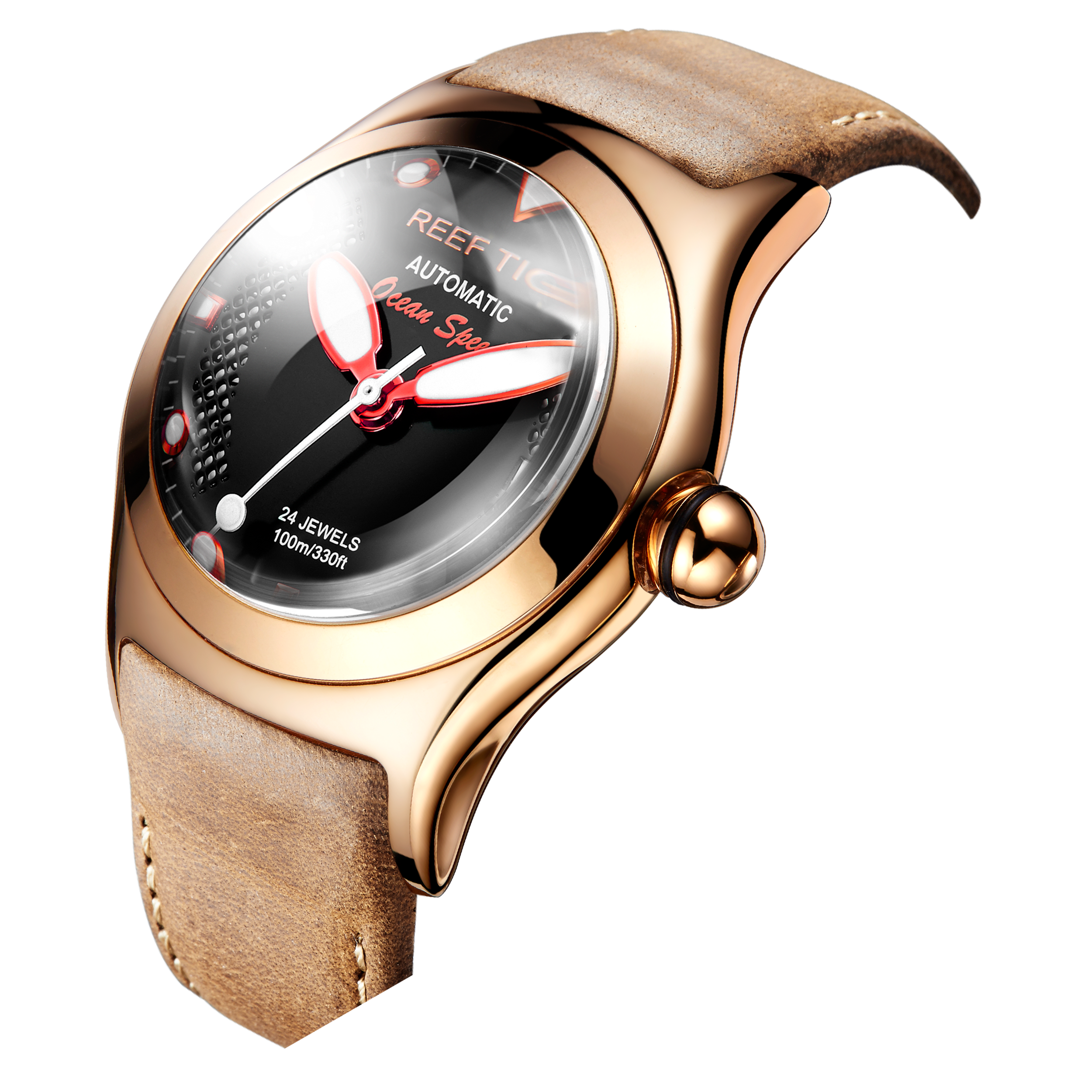 Aurora Ocean Speed Automatic 手表。耐用的不銹鋼鍍玫瑰金,固定表圈也配有打造專(zhuān)業(yè)外觀的提案和演示。耐用的聚酯前后蓋與協(xié)調(diào)。