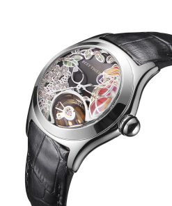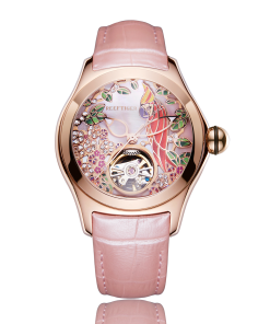 黑色表盤,帶鸚鵡圖案標(biāo)記。時(shí)、分、秒顯示。這款奢華腕表的表盤 12 點(diǎn)鐘位置印有品牌標(biāo)識(shí)。