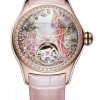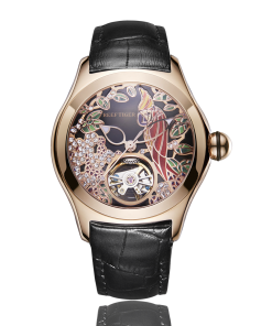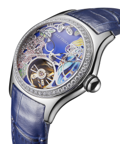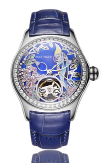 藍(lán)色表盤,帶鸚鵡圖案標(biāo)記。時(shí)、分、秒顯示。這款奢華腕表的表盤 12 點(diǎn)鐘位置印有品牌標(biāo)識。