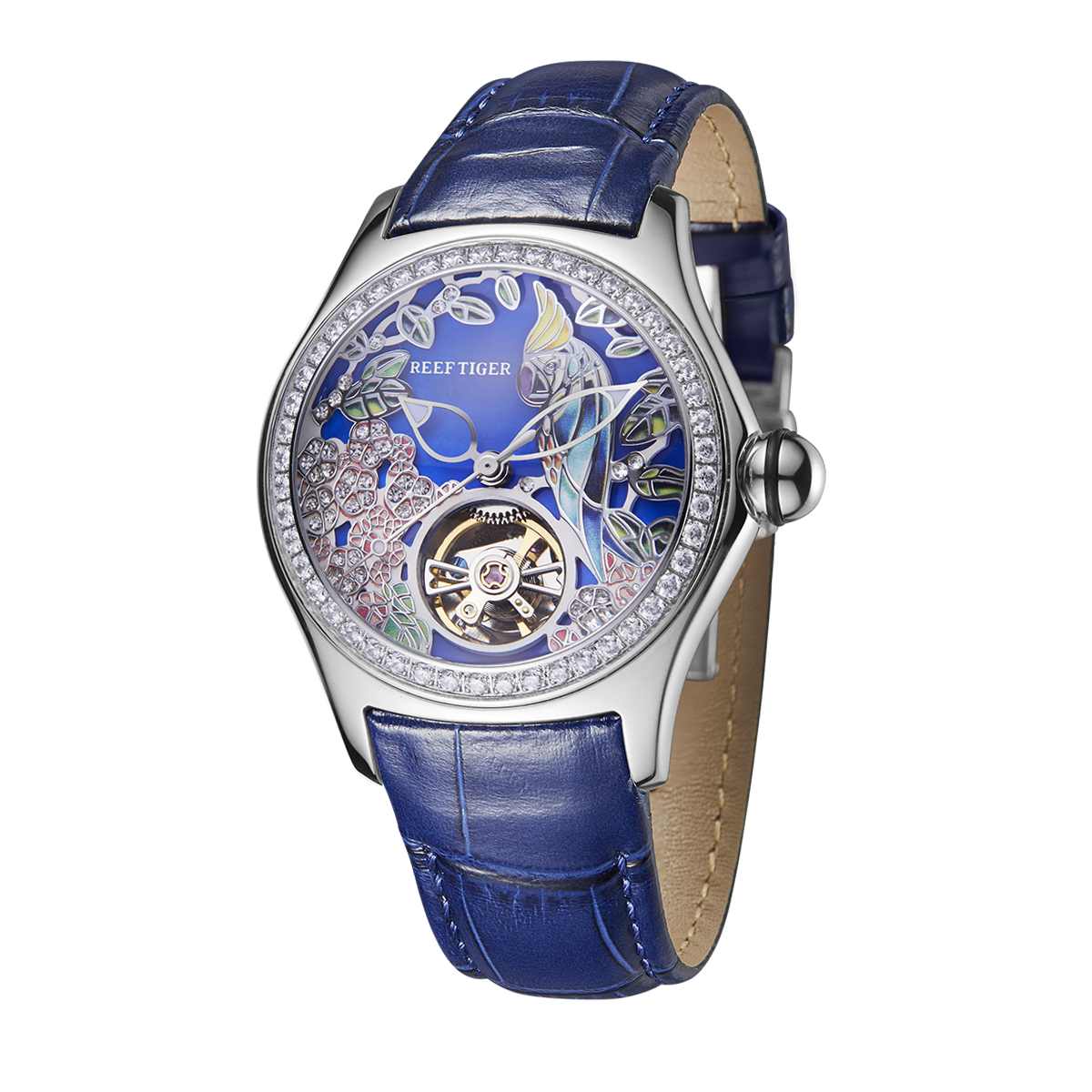 Reef Tiger Aurora 鸚鵡腕表。耐用的不銹鋼表圈,不銹鋼鉆石表圈還配有可打造專業(yè)外觀的提案和演示。耐用的聚酯前后蓋,協(xié)調(diào)一致。