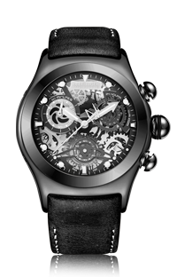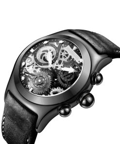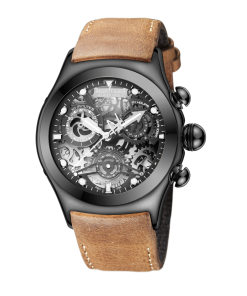 鏤空表盤配有三個(gè)子表盤。計(jì)時(shí)碼表、小時(shí)、分鐘、秒和日期顯示。這款時(shí)尚的男士手表在表盤 12 點(diǎn)鐘位置印有其標(biāo)志。