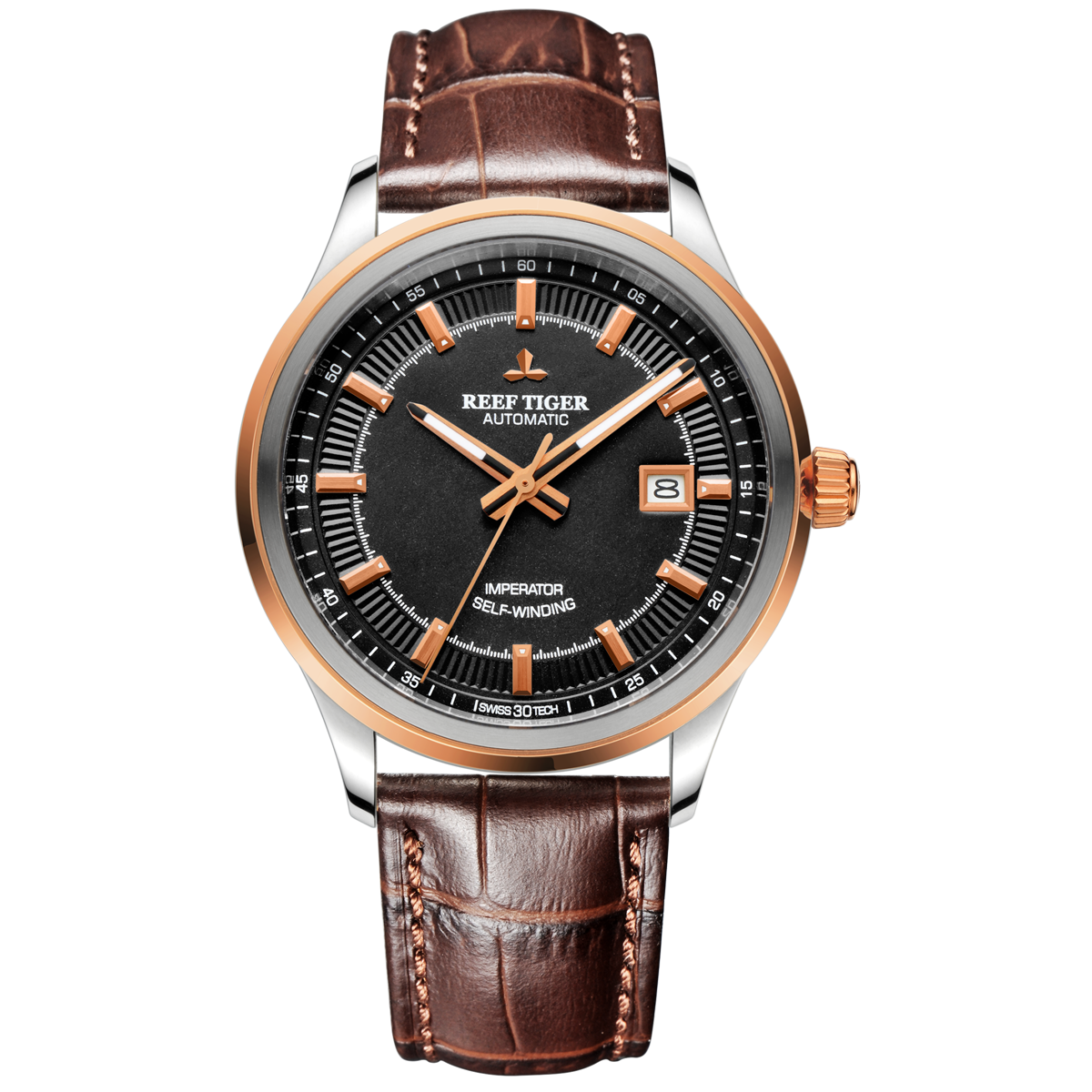 經(jīng)典 Imperator 男士腕表。耐用的不銹鋼玫瑰金表圈也適合打造專(zhuān)業(yè)的提案和演示。耐用的聚酯前后蓋與協(xié)調(diào)一致。