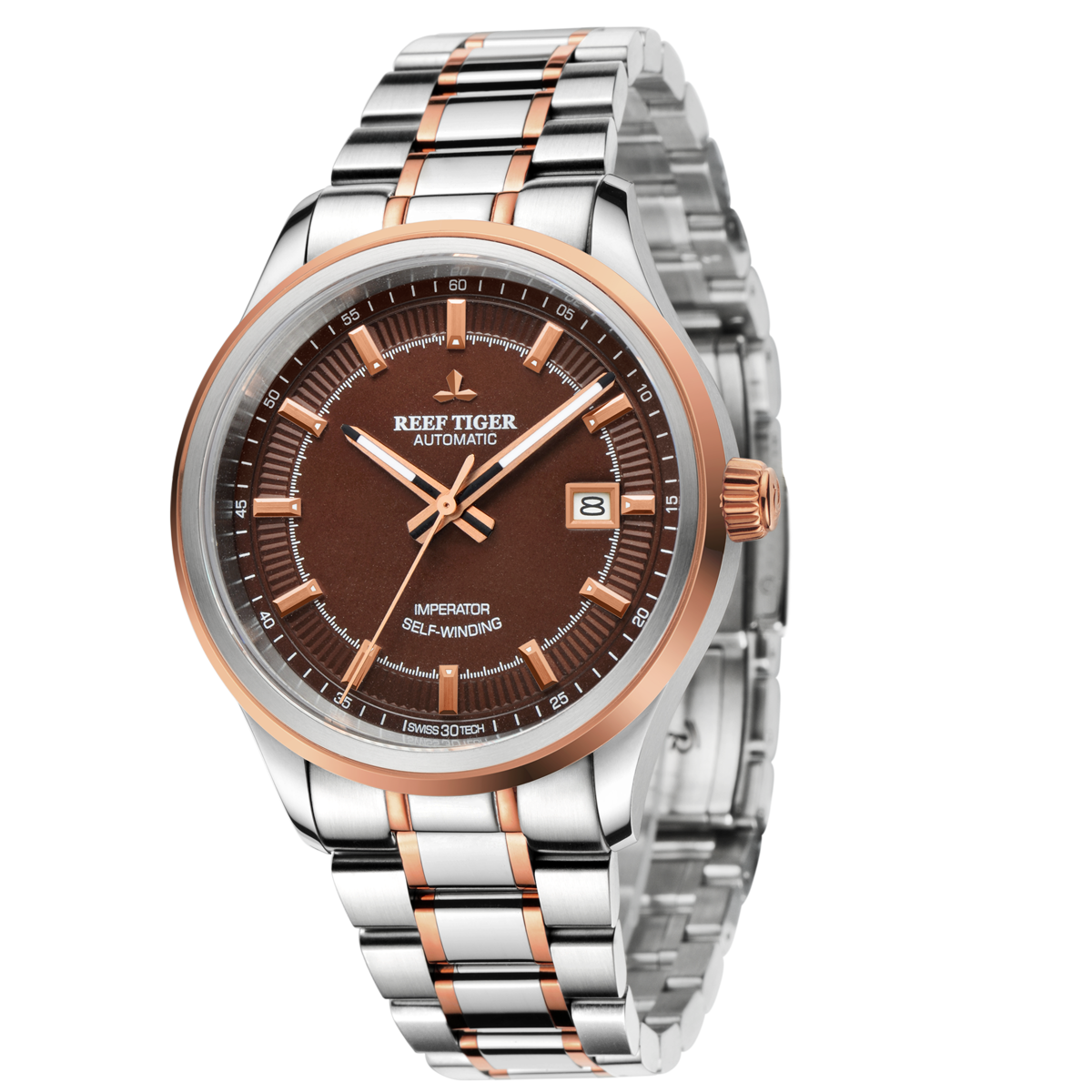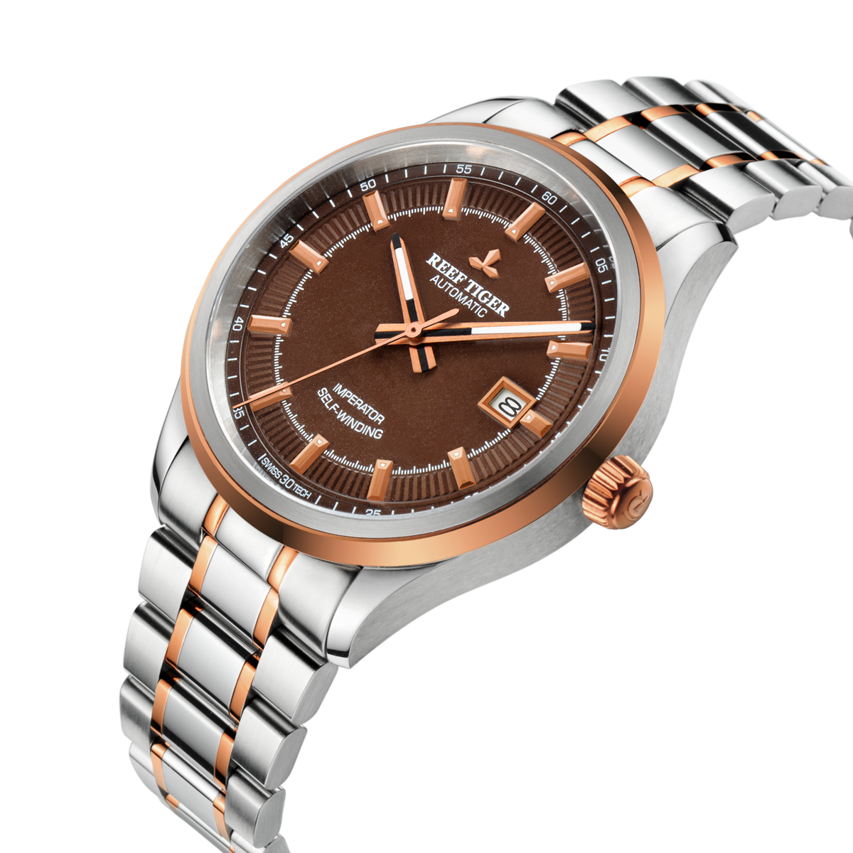 經(jīng)典 Imperator 男士腕表。耐用的不銹鋼玫瑰金表圈還配有打造專業(yè)外觀的提案和演示。耐用的聚酯前后蓋,協(xié)調(diào)一致。