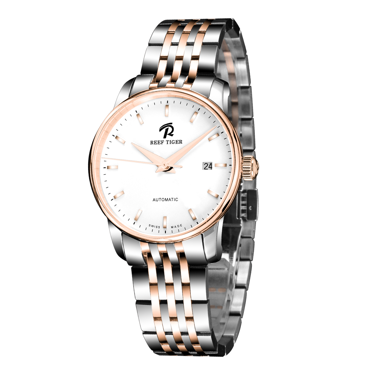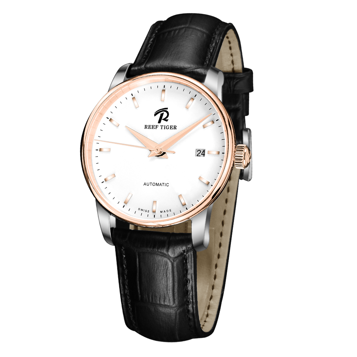白色表盤。這款雙色手表采用經(jīng)典的圓形表殼,搭配黑色表盤(玫瑰金條形刻度)和日期功能,非常適合男士佩戴。