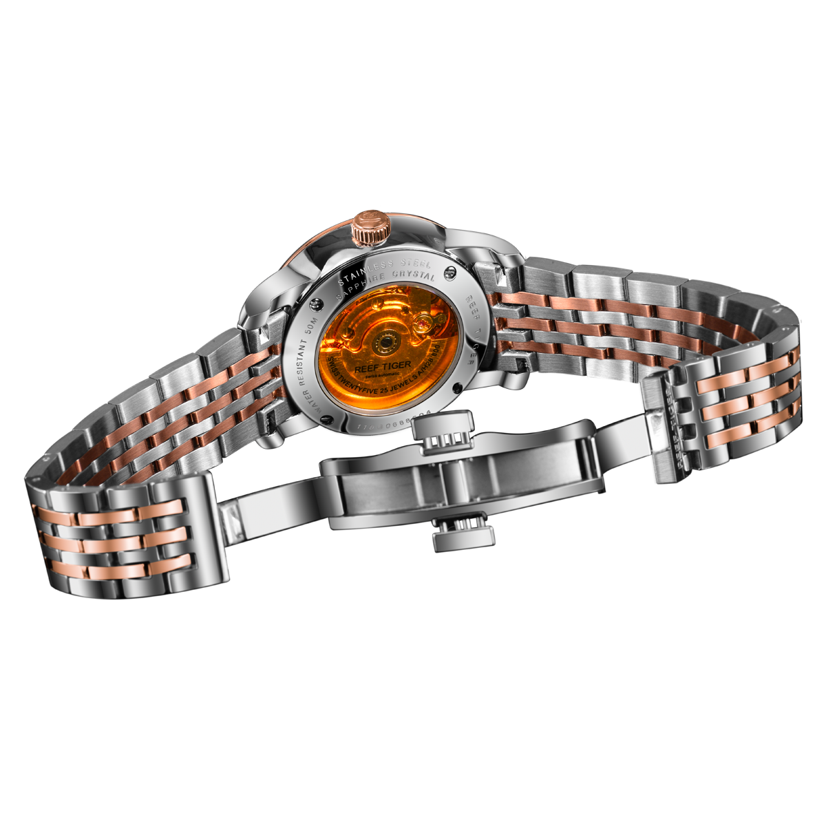 瑞士 Reef Tiger RT3101 自動(dòng)機(jī)芯因其可靠性和準(zhǔn)確性以及高寶石率(28,800vph,24 顆寶石)而備受青睞,可提供 32 小時(shí)的動(dòng)力儲(chǔ)存。