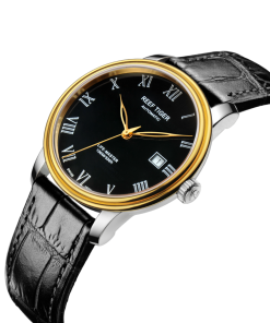 黑色表盤,帶羅馬刻度。時(shí)、分、秒和日期顯示。這款奢華腕表的表盤 3 點(diǎn)鐘位置印有其標(biāo)志。