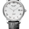 白色表盤帶羅馬刻度。時(shí)、分、秒和日期顯示。這款豪華腕表在表盤 3 點(diǎn)鐘位置有其標(biāo)志。