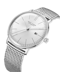 白色表盤(pán),帶條形標(biāo)記。時(shí)、分、秒和日期顯示。這款奢華腕表的表盤(pán) 12 點(diǎn)鐘位置印有品牌標(biāo)識(shí)。