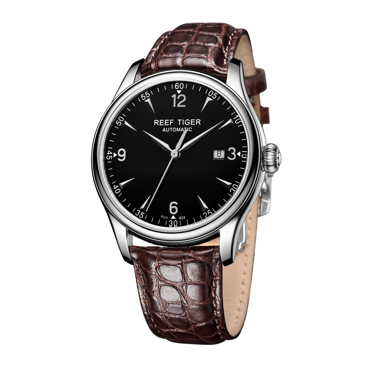 黑色鱷魚皮表帶,配有折疊扣。