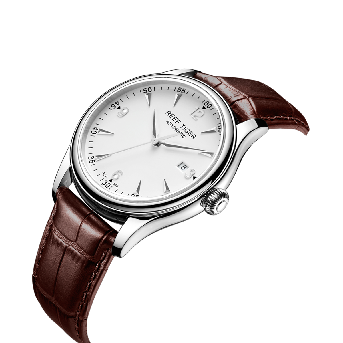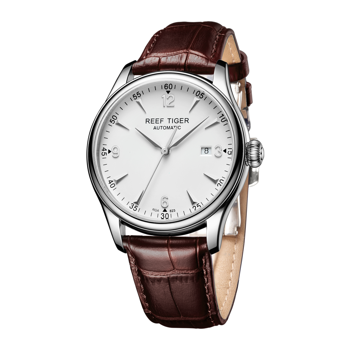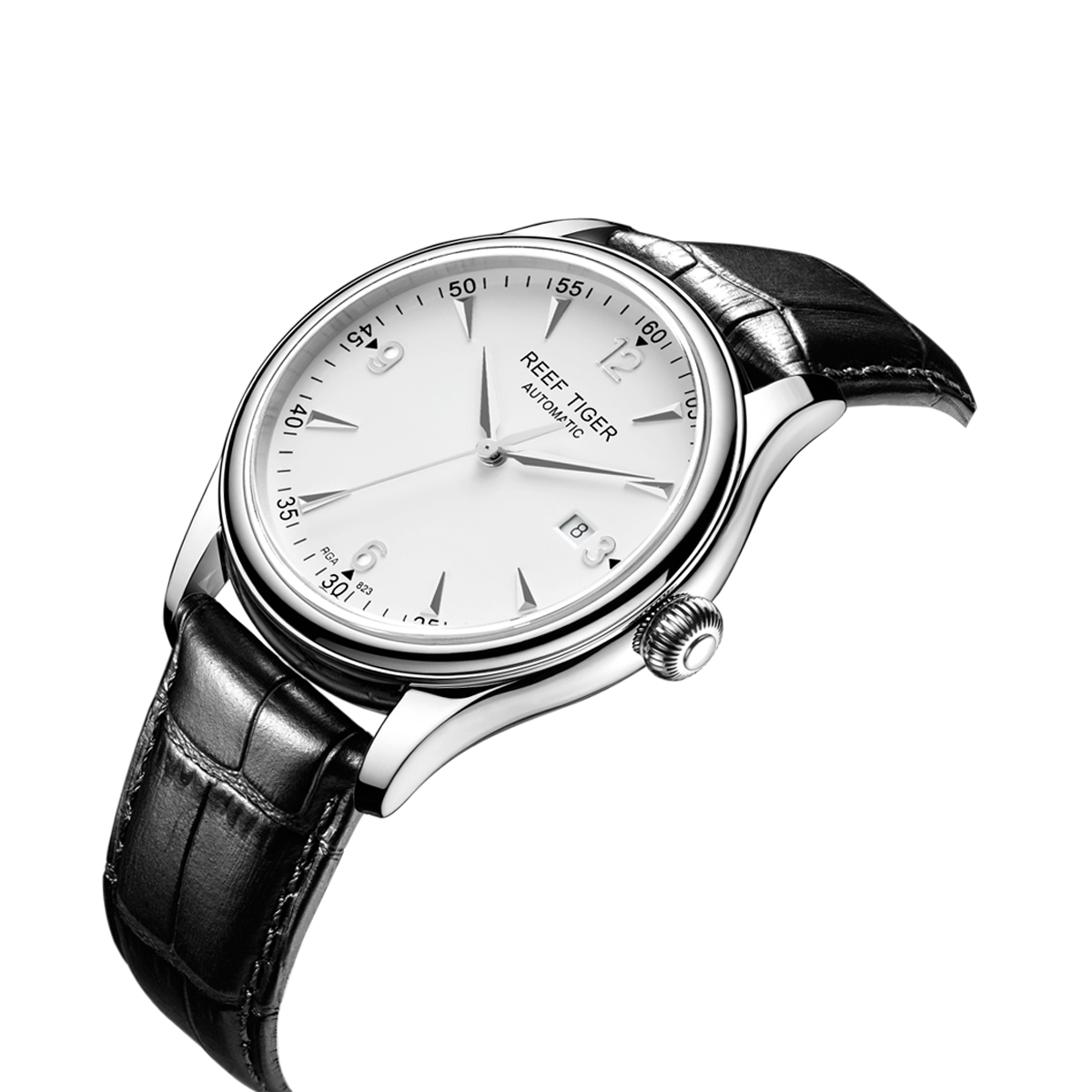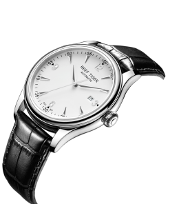 白色表盤,帶銀色棒狀和羅馬數(shù)字標記。時、分、秒和日期顯示。