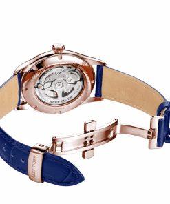 藍色表盤,配玫瑰金棒和鉆石標記。小時、分鐘、秒、星期和日期顯示。