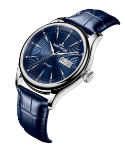 藍(lán)色表盤,配銀色棒狀和鉆石標(biāo)記。小時(shí)、分鐘、秒、星期和日期顯示。