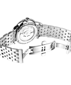 黑色表盤(pán),帶羅馬刻度。時(shí)、分、秒和日期顯示。這款時(shí)尚手表的表盤(pán) 6 點(diǎn)鐘位置印有品牌標(biāo)志。