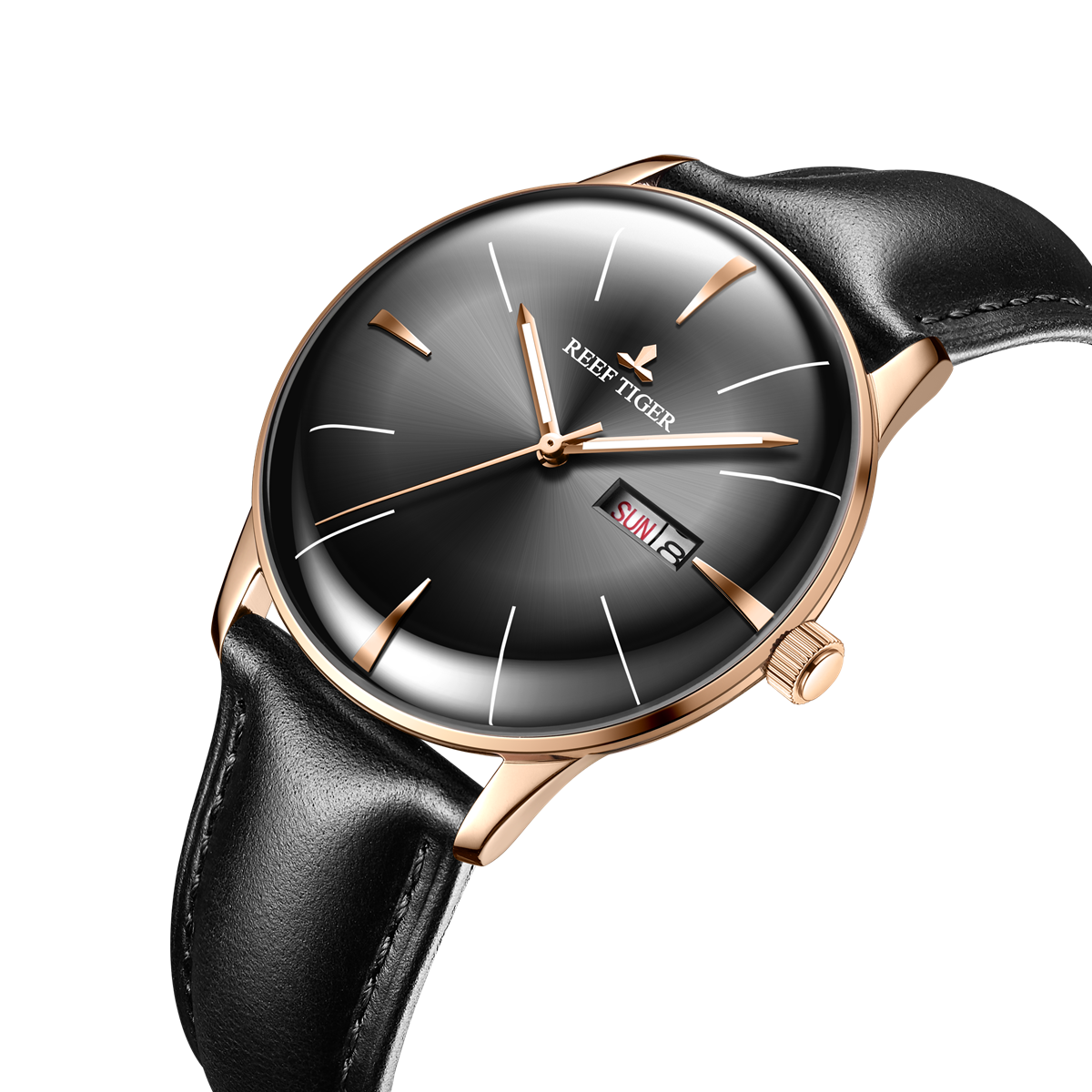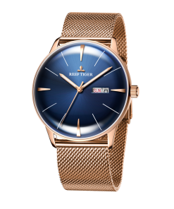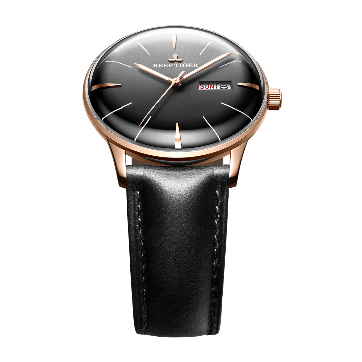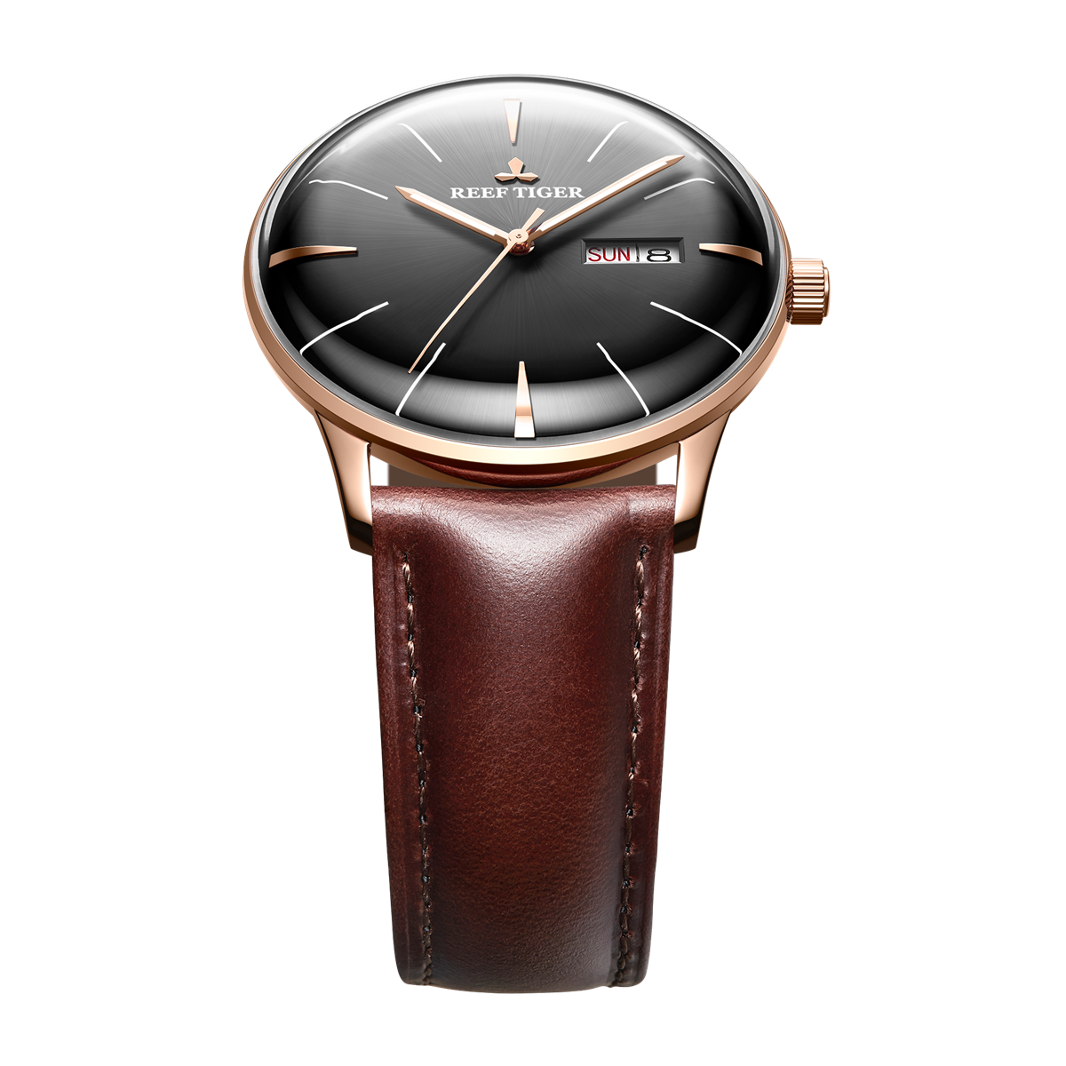 Reef Tiger 經(jīng)典 Heritor 腕表。耐用的不銹鋼玫瑰金表圈還配有可打造專業(yè)外觀的提案和演示。耐用的聚酯前后蓋與表盤相得益彰。