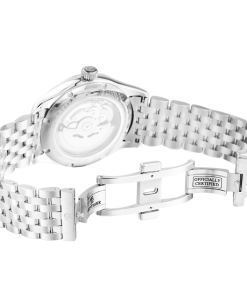 白色表盤,配銀色棒狀和羅馬數(shù)字標(biāo)記。小時(shí)、分鐘、秒和日期顯示。
