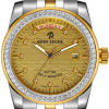 香檳色表盤。這款雙色腕表采用經(jīng)典圓形表殼搭配白色表盤(十顆鉆石和十二個(gè)黃金棒狀時(shí)標(biāo)),日期和星期顯示分別位于 3:00 和 12:00 位置。