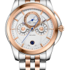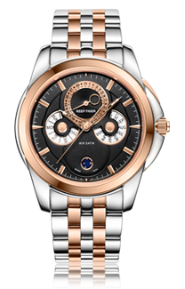 黑色表盤搭配玫瑰金棒狀標(biāo)記。時(shí)、分、秒、日期、星期和月相顯示。這款奢華腕表的表盤 12 點(diǎn)鐘位置印有品牌標(biāo)識。
