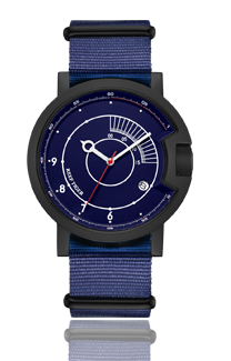 藍色表盤,帶阿拉伯數(shù)字標記。時、分、秒和日期顯示。這款奢華腕表的表盤 8 點鐘位置印有品牌標識。