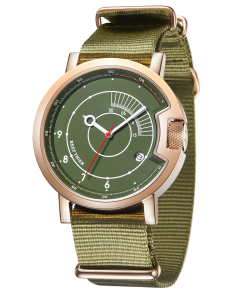 綠色表盤,帶阿拉伯數(shù)字標記。時、分、秒和日期顯示。這款奢華腕表的表盤 8 點鐘位置印有品牌標識。