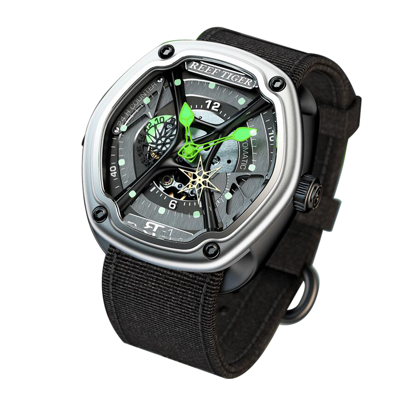 四層表盤,指針和指針上的亮綠色夜光 Luminova 位于藍(lán)寶石玻璃下方,24 小時指示器也是如此。時針、分針、小秒針和 24 小時指針顯示。這款豪華手表在表盤 12 點鐘位置有其標(biāo)志。