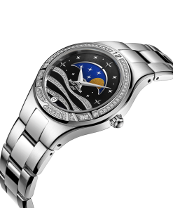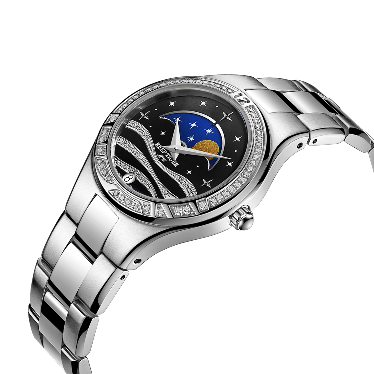 這款腕表的表殼采用不銹鋼材質(zhì),表殼尺寸為30*8mm,延續(xù)了瑞夫泰格Love Stars系列腕表的簡(jiǎn)潔線條。月相的設(shè)計(jì)獨(dú)特而和諧。其弧度符合人體工程學(xué)設(shè)計(jì),確保佩戴舒適。