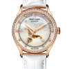 白色 MOP 表盤,帶鉆石標(biāo)記。時(shí)、分、秒顯示。這款奢華腕表的表盤 12 點(diǎn)鐘位置印有其標(biāo)志。