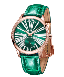 綠色表盤(pán),帶羅馬數(shù)字鉆石標(biāo)記。顯示小時(shí)、分鐘和秒。這款奢華腕表的表盤(pán) 12 點(diǎn)鐘位置印有品牌標(biāo)識(shí)。