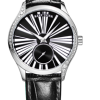 藍(lán)色表盤,帶羅馬數(shù)字鉆石標(biāo)記。顯示小時、分鐘和秒。這款奢華腕表的表盤 12 點鐘位置印有品牌標(biāo)識。