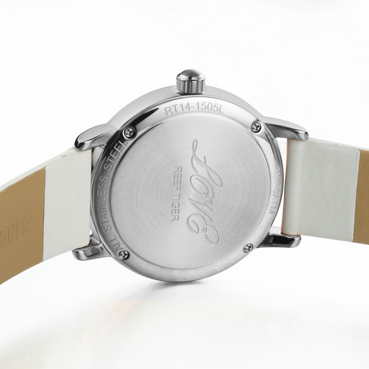 女士愛(ài)情承諾腕表。耐用的不銹鋼表圈,鑲嵌施華洛世奇水晶,打造專業(yè)的求婚和演示。耐用的聚酯前后蓋,協(xié)調(diào)一致。