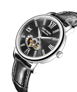 黑色表盤,帶羅馬數(shù)字鉆石標(biāo)記。顯示小時(shí)、分鐘和秒。這款奢華腕表的表盤 12 點(diǎn)鐘位置印有品牌標(biāo)識(shí)。