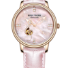 粉色表盤,帶旋律圖案標記。時、分、秒顯示。這款豪華手表的標志位于 12 點鐘位置。