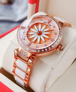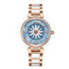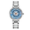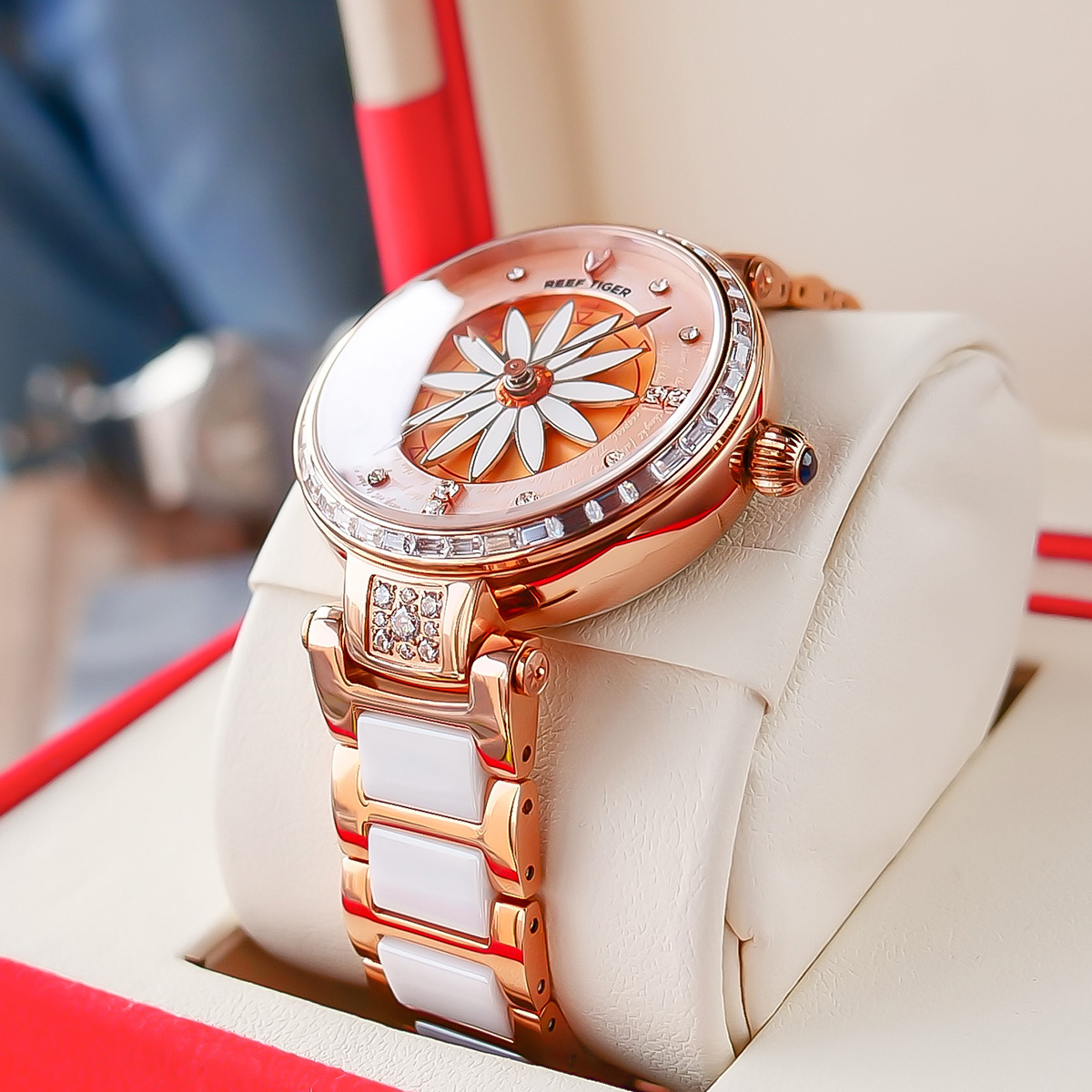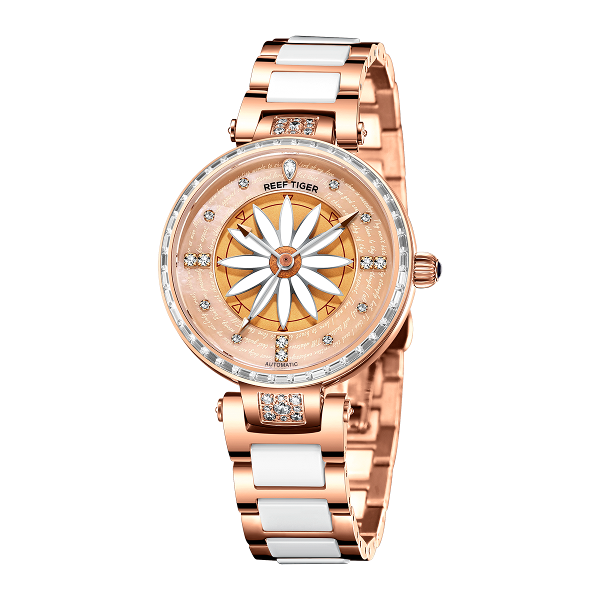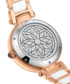 表盤配有鉆石標記。顯示時、分、秒。手表表盤中央有一朵美麗的百合花。