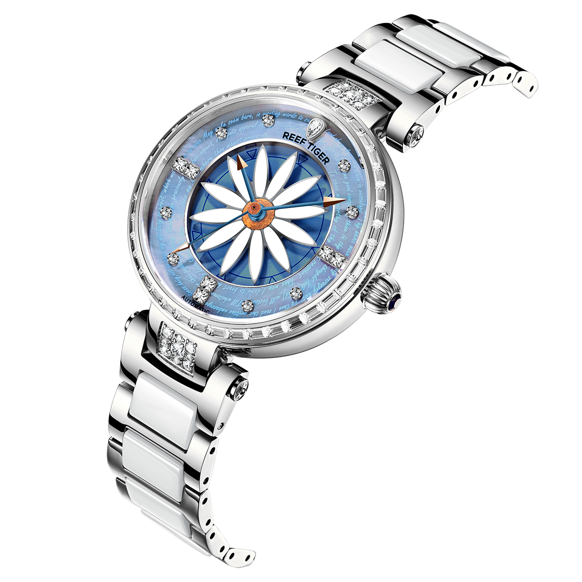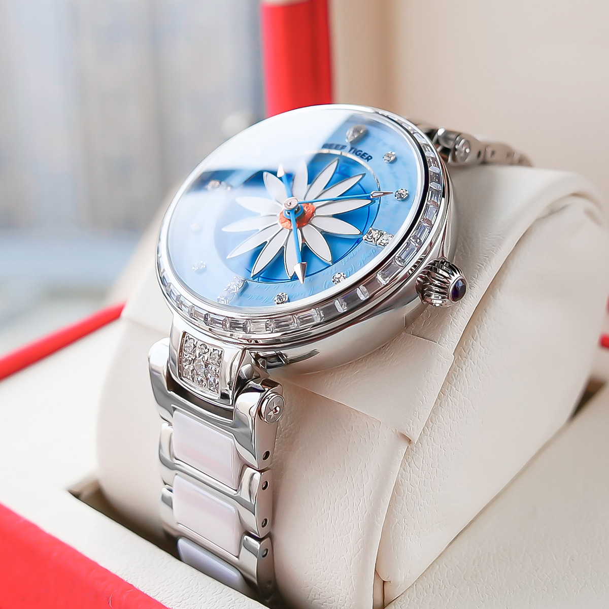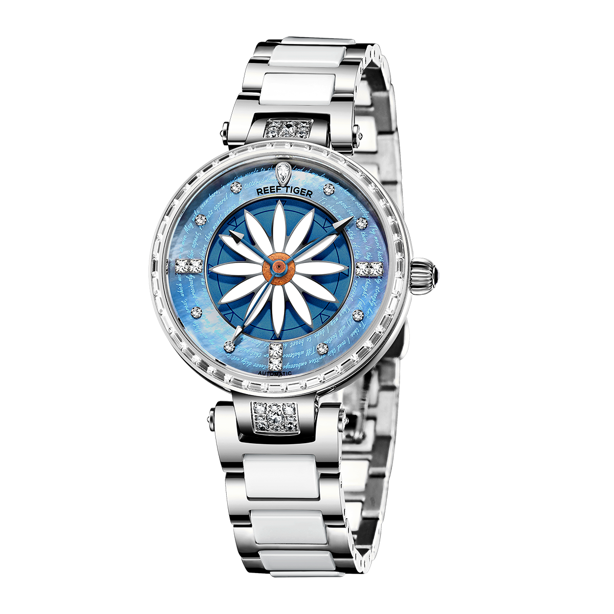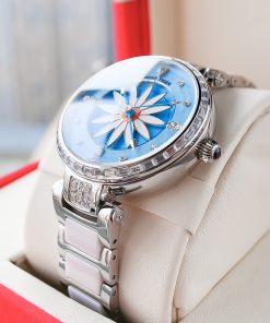 表盤配有鉆石標記。顯示時、分、秒。手表表盤中央有一朵美麗的百合花。